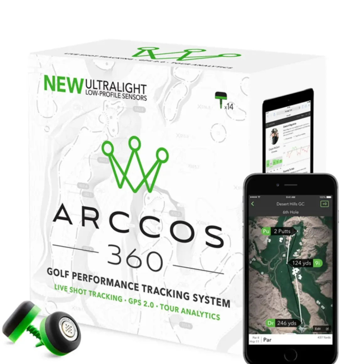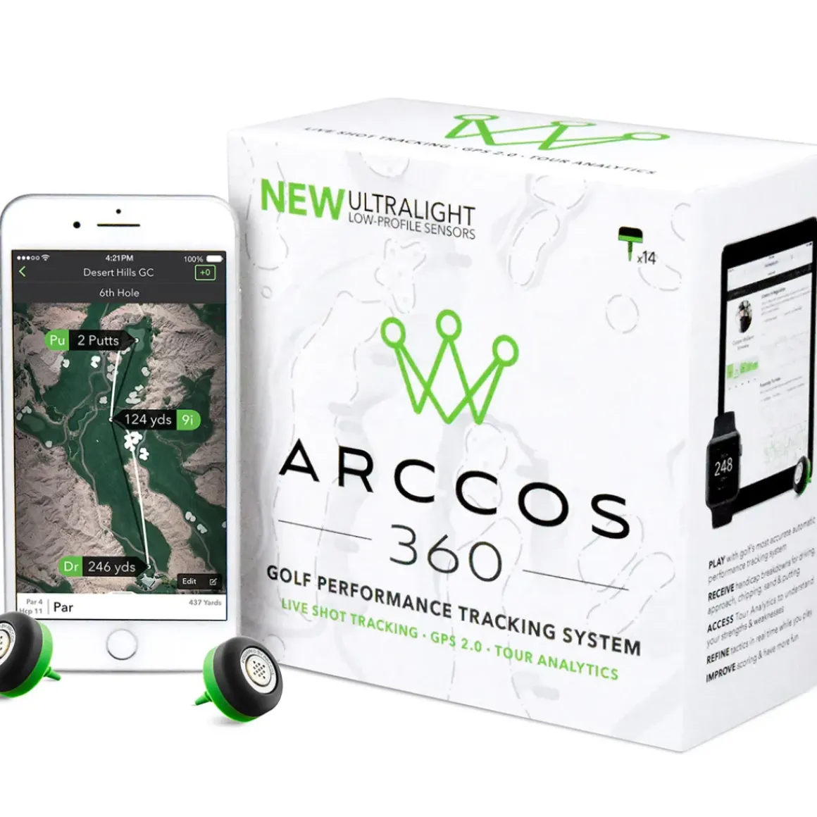 Improve your game faster than ever before, with fully automatic Arccos 360 golf tracking system. This second generation system has an ultra-light profile which provides enhanced shot detection algorithm, with GPS 2.0 App and Tour Analytics to give you valid insight and to make a more improved on-course decision.