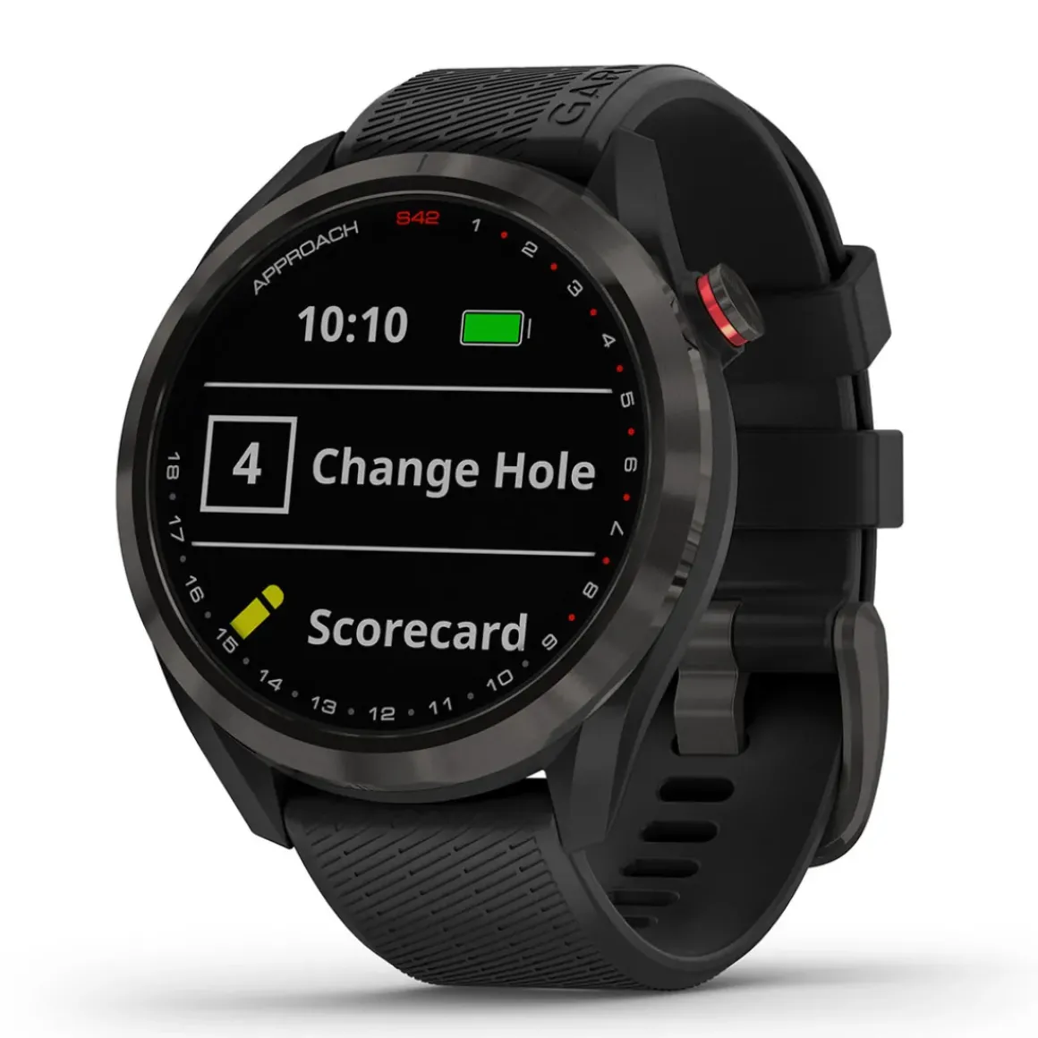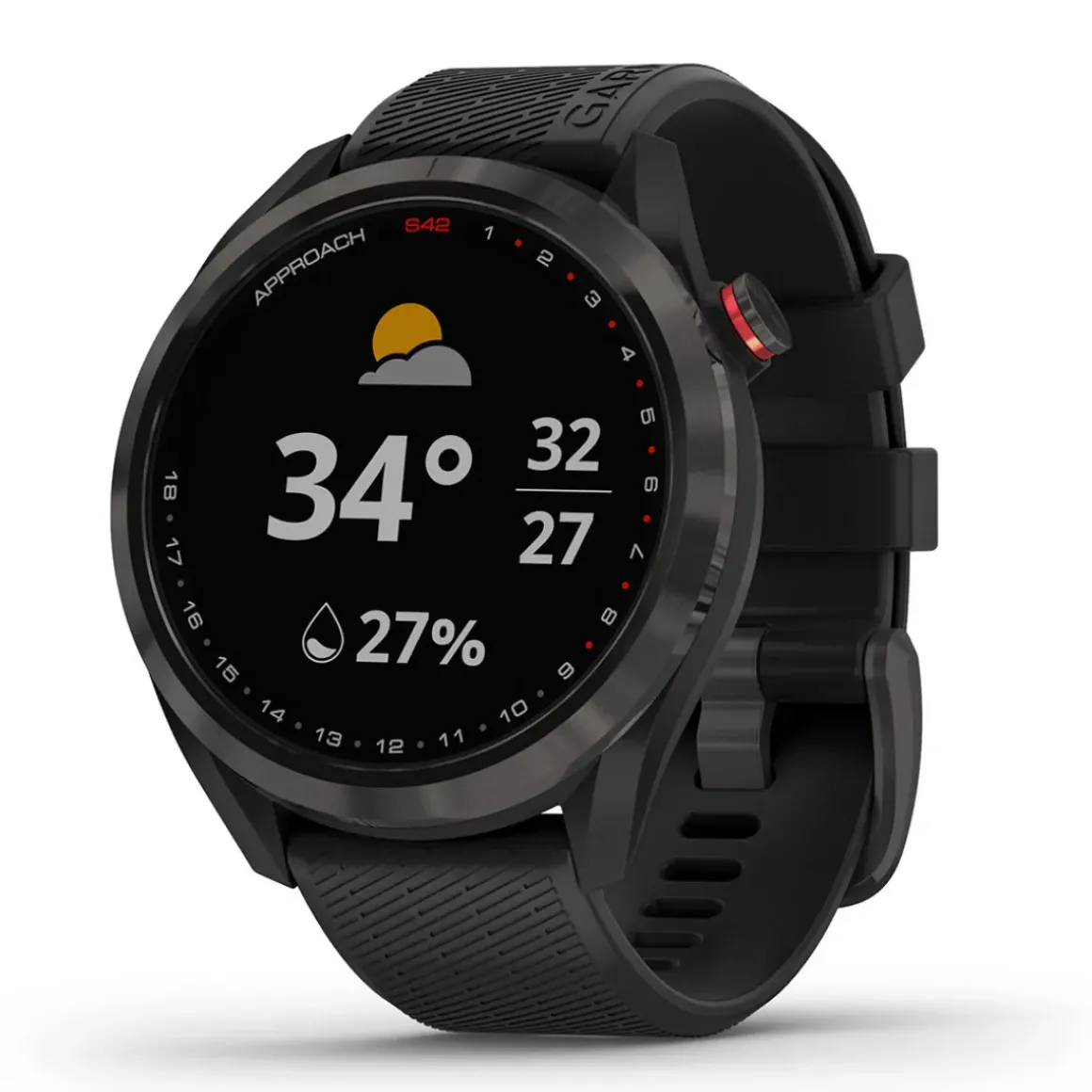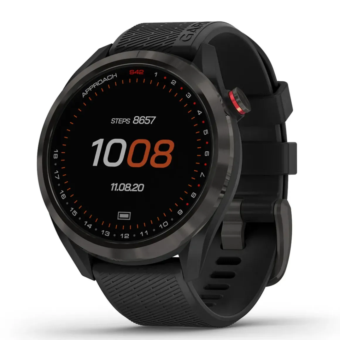 The Approach® S42 GPS golf smartwatch with its stylish new bezel design, lens artwork, bands, and colour options. It provides all the key distances on the course to help make the right shot, including green view and pin positioning for the ultimate in precision. It also tracks your activities away from the course to help you keep in shape.
