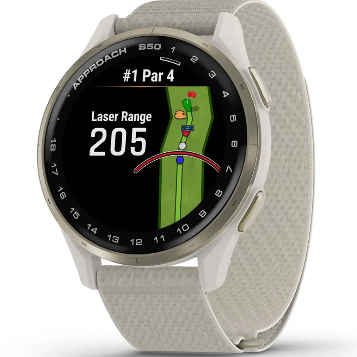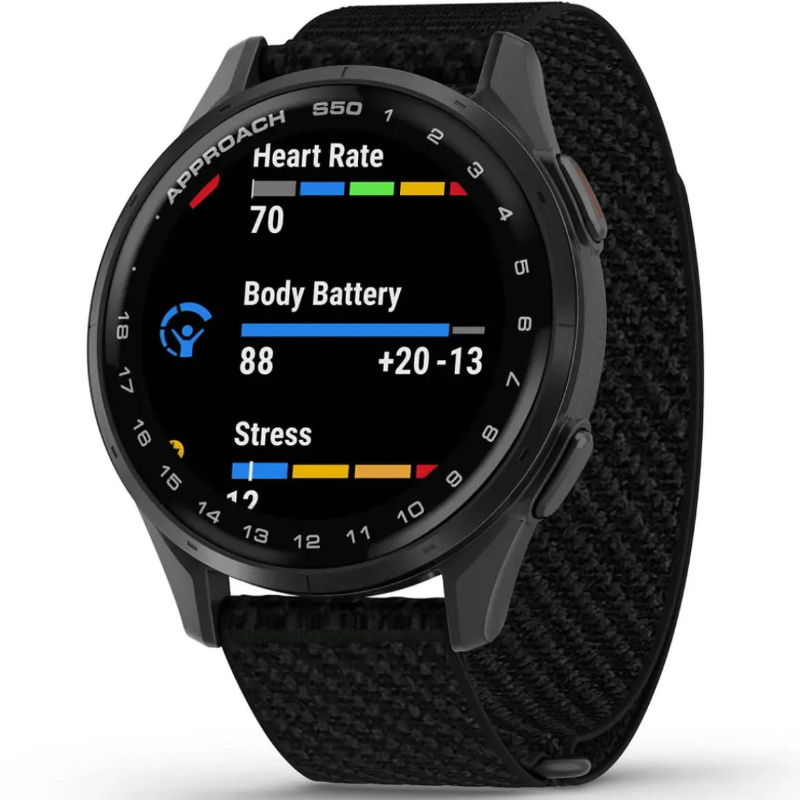 Garmin has got your game with Approach® S50, the GPS golf watch that gives you what you need on the course and beyond. Its slim, lightweight design and ComfortFit nylon strap make it easy to wear all day. It’s bright 1.2” AMOLED display makes it easy to see key yardages to the green, hazards, doglegs and Playslike Distance on 43,000+ preloaded courses worldwide. Off the course, stay on top of your health with activity profiles for strength, yoga and running, plus heart rate and advanced sleep monitoring.