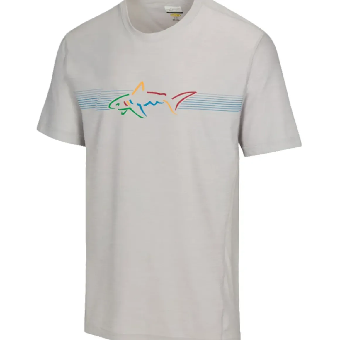 This classic fit Greg Norman shirt has a polyester mesh construction with added stretch to provide everyday comfort. It is lightweight and breathable and equipped with PLAY DRY®. One of the leading moisture-management systems to keep you dry. The t-shirt has a crewneck design and is highlighted with a shark front graphic logo for added appeal.
