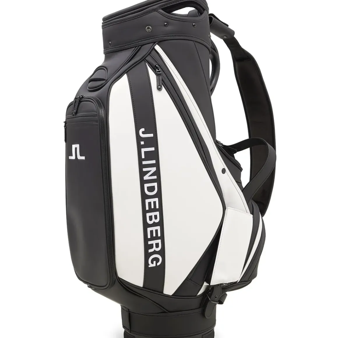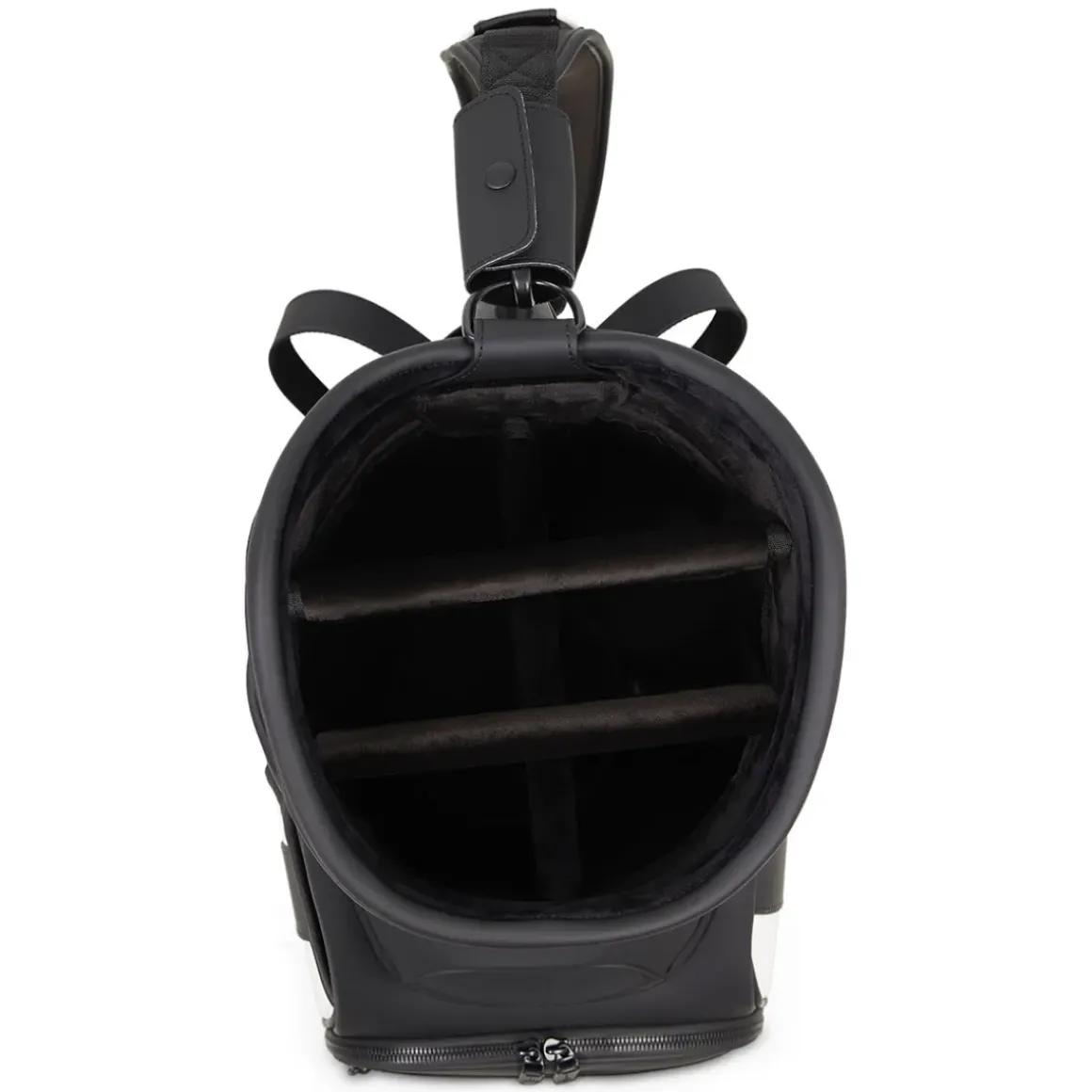 This bag has a premium and oversized construction to organise like a professional golfer. It has a sturdy steel ring top construction, a round base suitable for most golf carts, and durable synthetic leather material for easy maintenance.