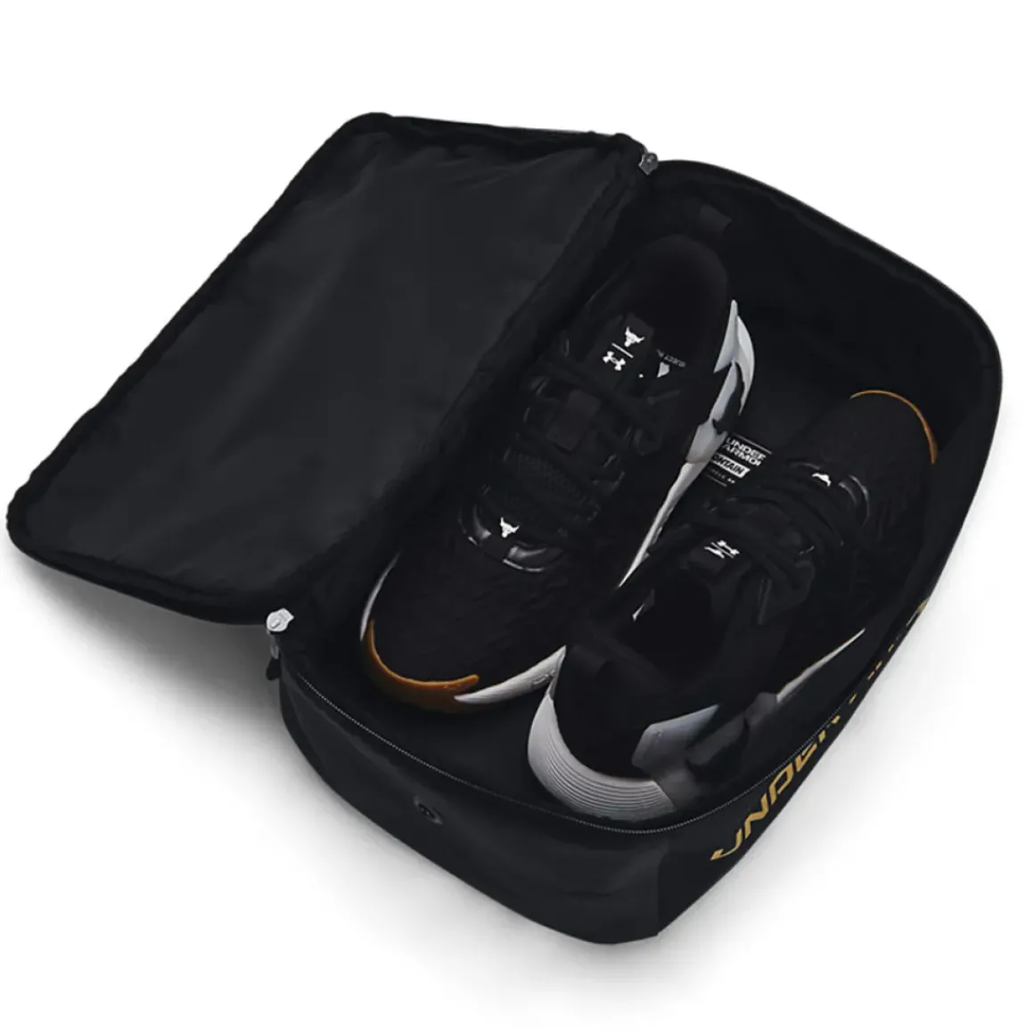 The Under Armour Contain shoe bag has durable PU-coated construction with UA Storm technology to keep your stuff dry and protected. It fits up to a size 14 golf shoe, with a zip opening for easy access. Plus features a front zip pocket with a D-ring attachment point for additional accessories.
