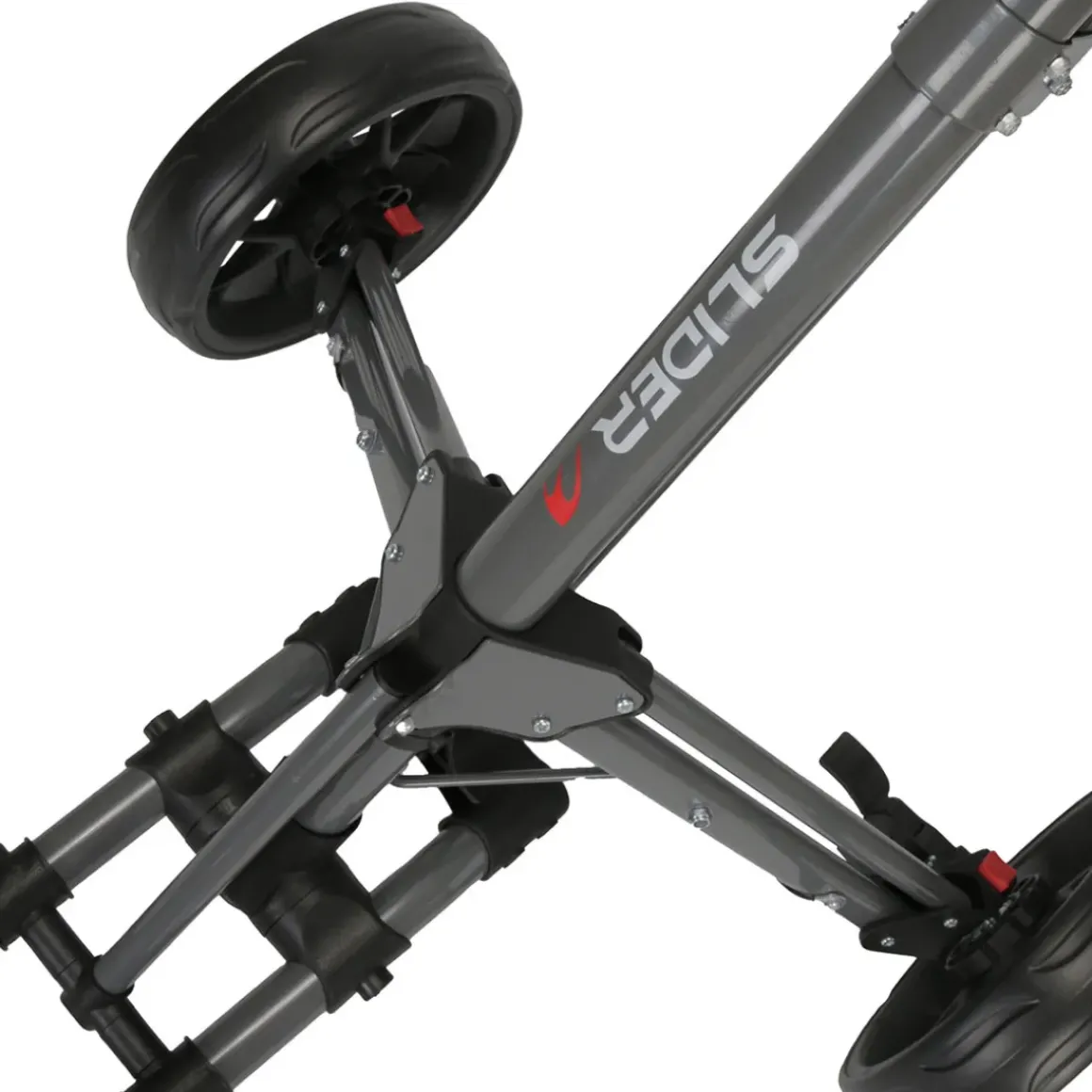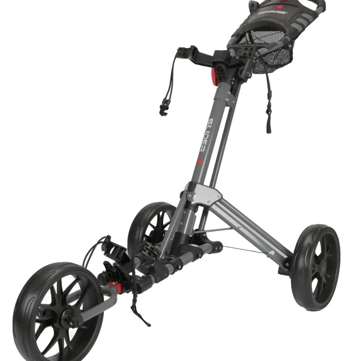 The Slider 3-wheel push trolley has a sporty and sturdy construction, with upper and lower bag straps to accommodate even the largest of golf bags. It provides easy folding and includes the umbrella attachment point, scorecard and bottle holder, unlike most leading brands. Other features include a foot parking brake, valuables compartment, and has a removable front wheel to fit in tighter storage spaces.