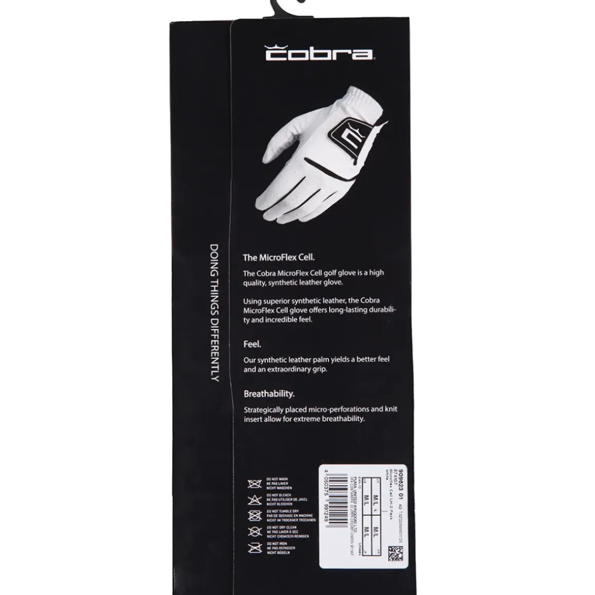 The golf glove has been designed with synthetic leather and 2 pads of sheep leather on the palm and thumb for more performance and durability, It is flexible to move and fit more precisely with perforations in the fingers to enhance breathability. The glove has a Velcro closure with COBRA COBRA branding. (2 individual gloves in the pack).