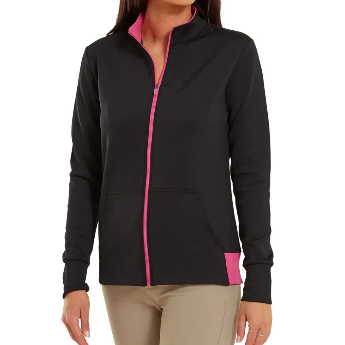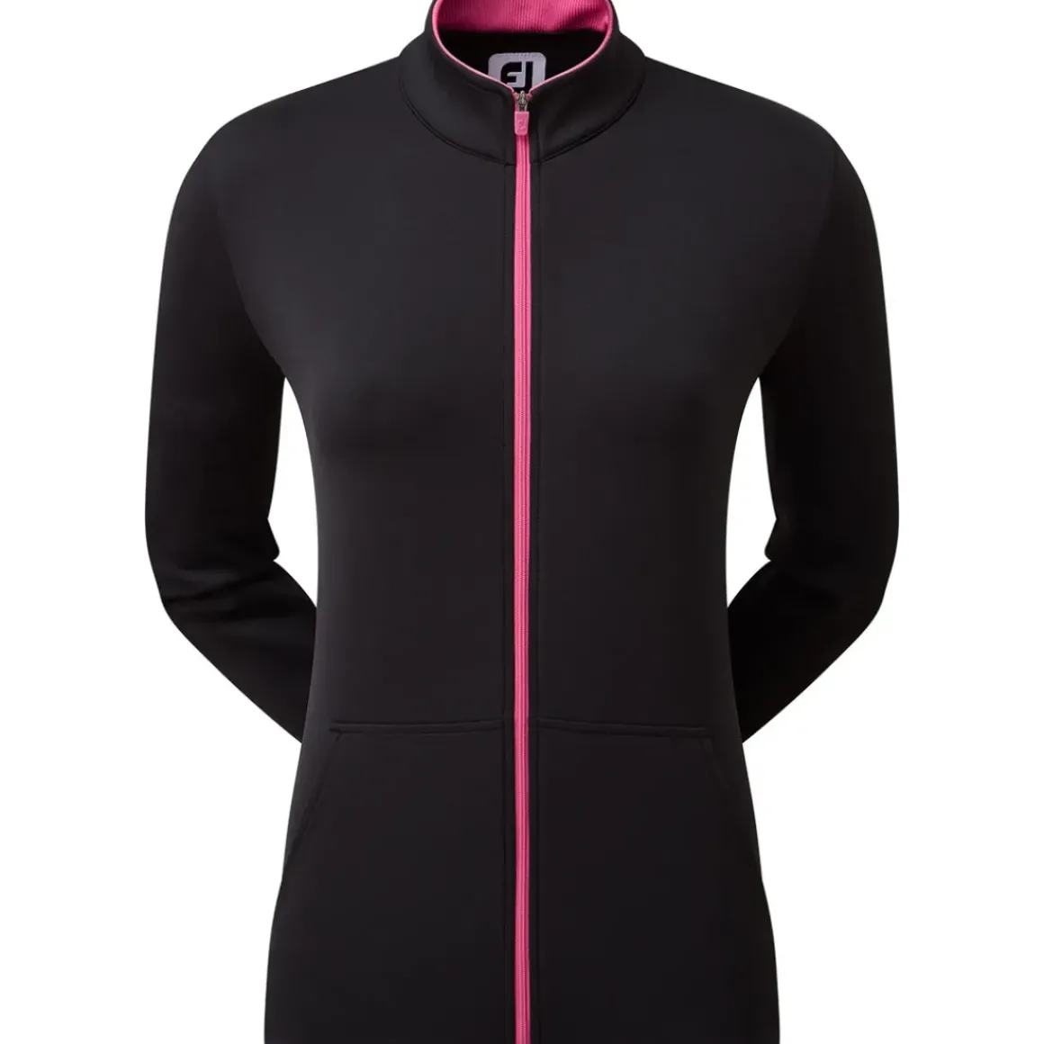 This versatile FootJoy golf mid-layer has a stretch double-layer jersey fabric construction to ensure you can move freely in comfort. This is moisture-wicking to help you stay dry and is easy-care, with a full-zip opening for easy changing. FootJoy designed this garment with open hand pockets and a contrasting zip pull, plus a coordinating FJ logo on the rear yoke.