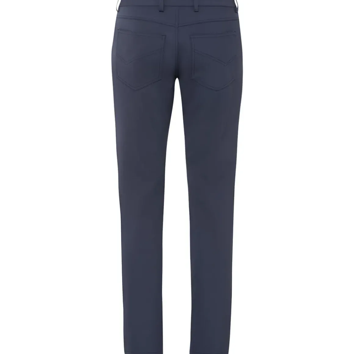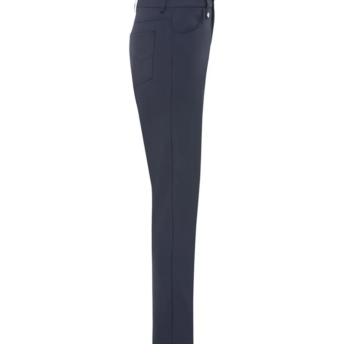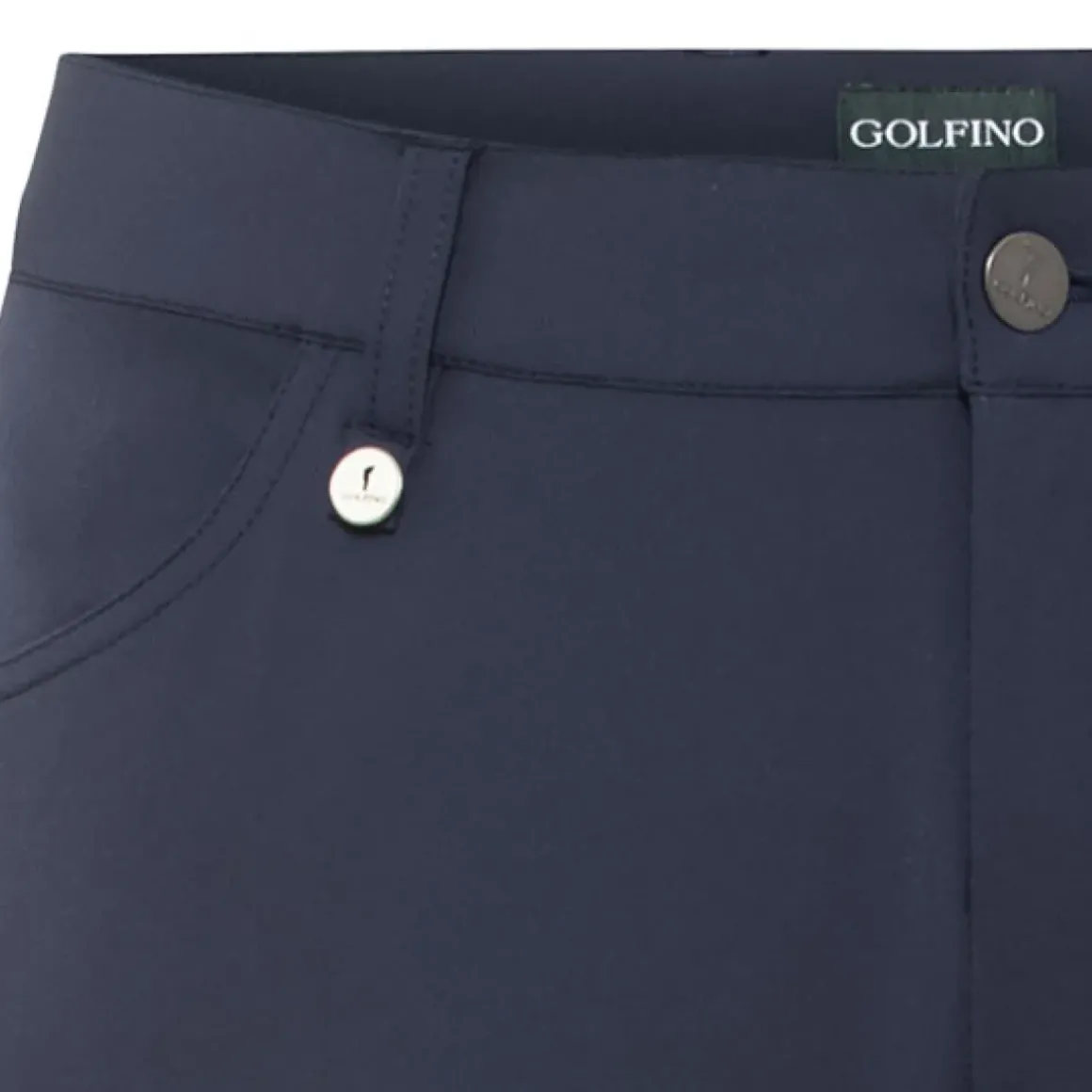 These extra slim fit and functional GOLFINO trousers are an excellent choice in changeable and rainy weather. Made from flexible Techno Stretch material that offers unrestricted freedom of movement during every swing. Trousers with a specially treated fabric surface to provide water-repellent protection. Highlighted with a metal button, a practical logo ball marker on one of the front belt loops, and decorative stitching on the back pockets for added style.