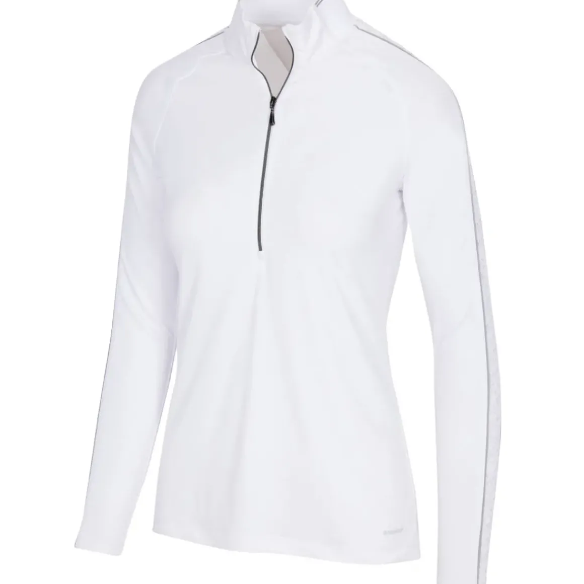 The Greg Norman Helene is a stylish half-zip mid layer with Solar XP fabric which offers chemical-free extreme 50+ sun protection. Complete with performance stretch and a lightweight luxurious hand feel for comfort as you perform. Other details include a gunmetal foil crosshatch print on the sleeve with piping, and a reflective Solar XP logo on the left hem.