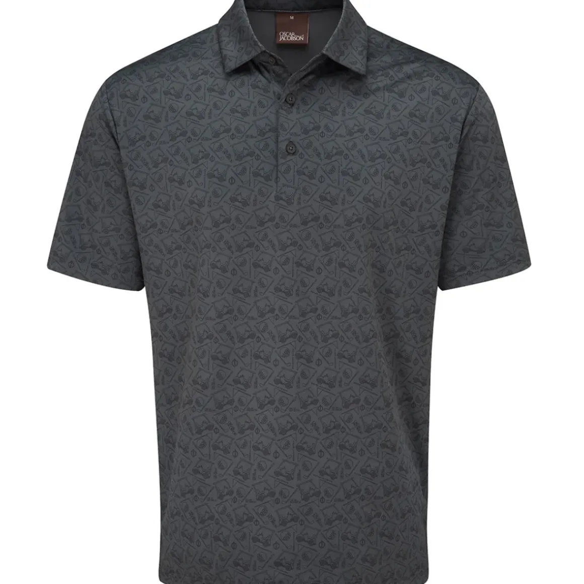 The Oscar Jacobson SONIC is a modern polo shirt which features a golf cart repeat all-over-print pattern using the OJ logo within the print. Made with a technical stretch fabric to allow you to perform without restriction. The fabric offers high levels of breathability to provide enhanced moisture management and extreme 50+ UPF protection. Designed with a 3-button placket, self-fabric stand collar, and an OJ logo flat print to the right sleeve and back neck.
