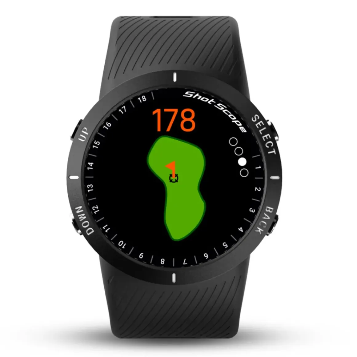 The Shot Scope V5 GPS golf watch offers golfers accurate distances combined with automatic performance tracking at an unbeatable price. Easy to use with a simple 4-button navigation, the V5 makes it straightforward to access features such as hazards, layups, and hole maps.