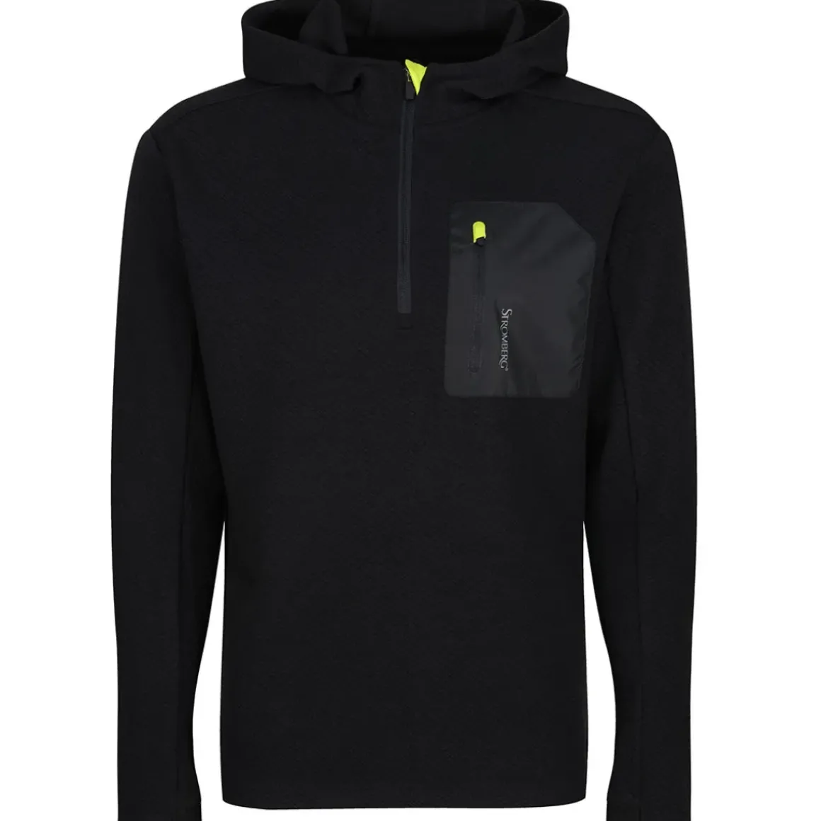 The Stromberg pocket hoody has a 4-way stretch and a textured spacer fabric construction to bring comfort as well as style to your golf swing. Plus is equipped with a durable water-repellent finish and an attached hood for shielding from the elements. The hoodie features a modern design with a bonded chest pocket, and a 1/2 zip opening for easy adjustment, along with silicone branding for maximum appeal.