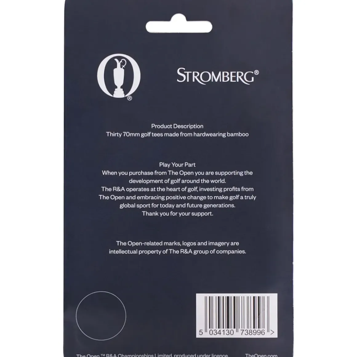 These 70mm Stromberg golf tees are made from sustainable bamboo, a supple and longer-lasting material with ‘elements’ colour rings for consistent tee placement. Complete with associated R&A Claret Jug branding for maximum appeal.