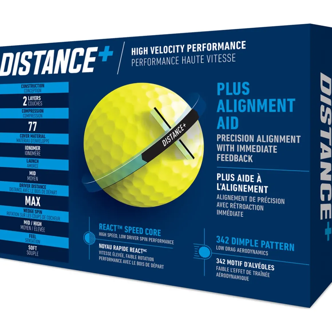 The Taylormade Distance Plus golf ball has been specifically designed to give more distance all shots. Speed enhanced with a high-velocity REACTâ„¢ Speed Core and advanced aerodynamic 342 cover, which offers low spin and less drag to improve your distance performance. This 2-piece ball has a soft feel and provides a mid ball flight trajectory, and offers maximum wedge spin for added short game control. This new ball comes with an alignment aid that provides immediate feedback after every putt.