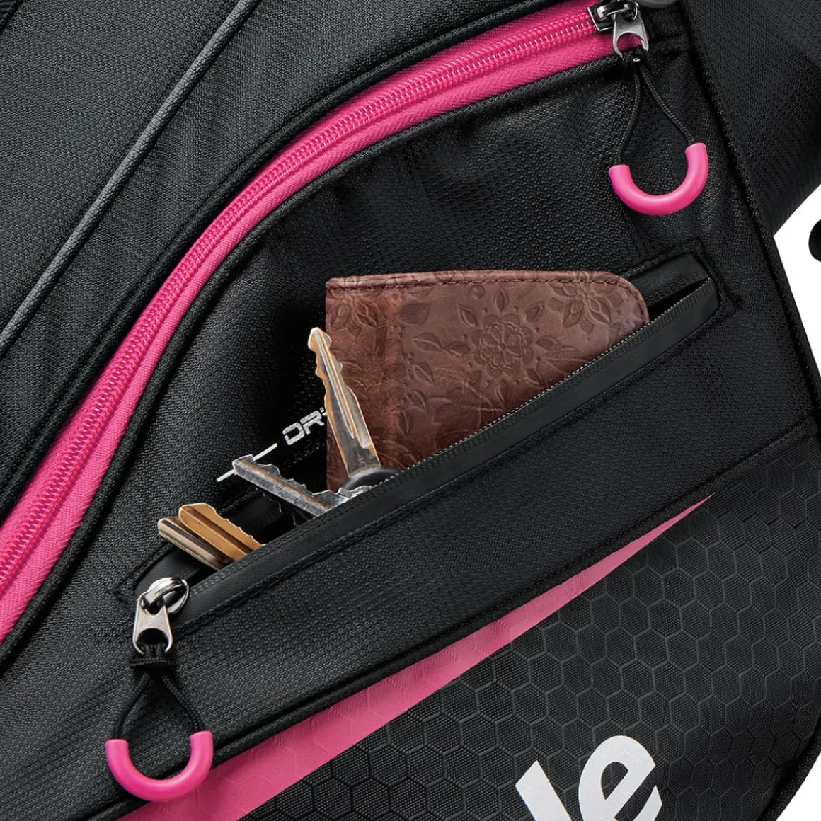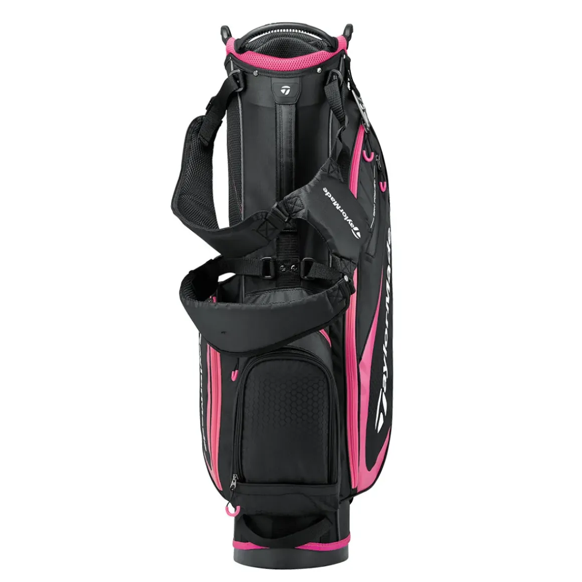 This superbly designed TaylorMade Select Plus Stand Bag features a 7-way top (9″) with a front integrated grab handle and 2 grab handles on the side covered with colour-coordinated air mesh cushioned fabric, with full length dividers.